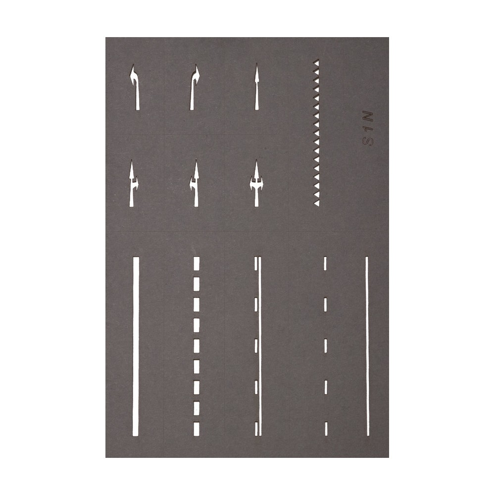 Dem Start-Set liegt je eine Schablone für die Spurweiten H0, TT und N als Muster bei. Eine größerere Auswahl an Schablonen mit verschiedenen Straßenmarkierungen wie Richtungspfeile, Zebrastreifen, Parkplatzsymbole und viele weitere Symbole ist für jede Spurweite separat erhältlich.