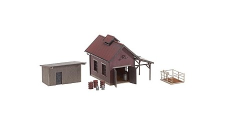 Für die Hausschlachtung. Ländliches Backstein-Schlachthaus mit Flügeltor, seitlicher Überdachung und einem freistehenden Schuppen. Zum Zubehör gehören eine Viehwaage (Lasercut), Wurstkessel und ein Tisch sowie Fässer, Kannen und allerlei Fleischwaren.
