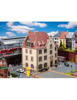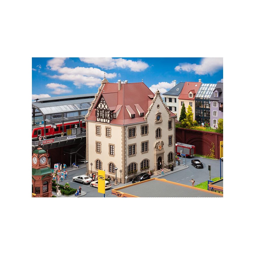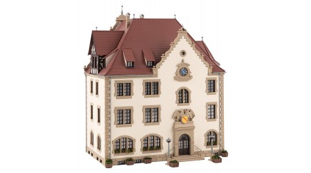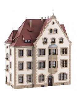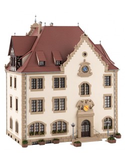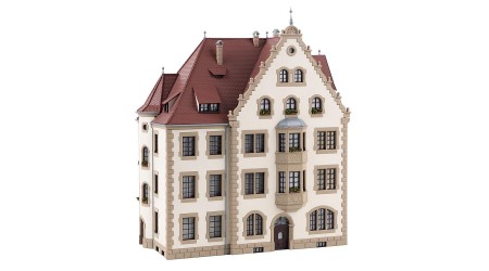 Repräsentatives, dreigeschossiges Gebäudemodell mit aufwändig gestalteten Fassadenelementen, wie gemauerte Fenstereinfassungen, Treppengiebel und Wappenbild sowie einem Fachwerk-Giebelhäuschen.