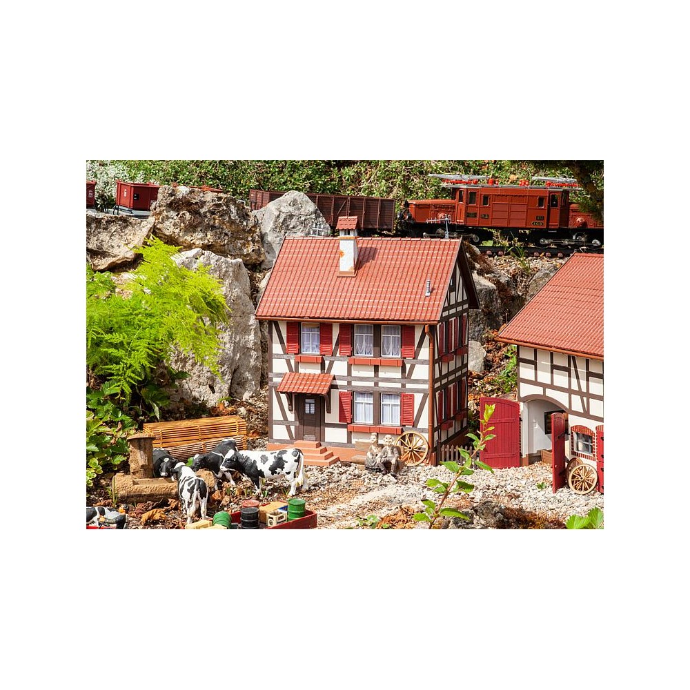 Zweistöckiges Fachwerkhaus mit überdachtem Hauseingang, Blumenkästen, Fensterläden und einem Ziegeldach mit Kamin. Passend zum Modell »Stallung«, Art. 331727.